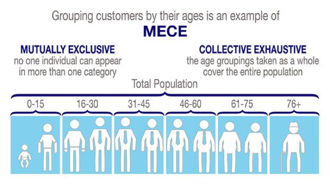 MECE là hệ thống giải quyết vấn đề giúp chúng ta giải quyết các vấn đề phức tạp. Nguyên tắc này cũng giúp bạn loại trừ những rắc rối để tập trung vào các dữ liệu căn bản, hướng tới thành công. MECE gợi ý cho chúng ta cách hiểu và giải quyết bất kỳ một vấn đề lớn nào. Chỉ cần bạn hiểu rõ các lựa chọn bằng cách chia nhỏ chúng thành các loại vấn đề nhỏ hơn: